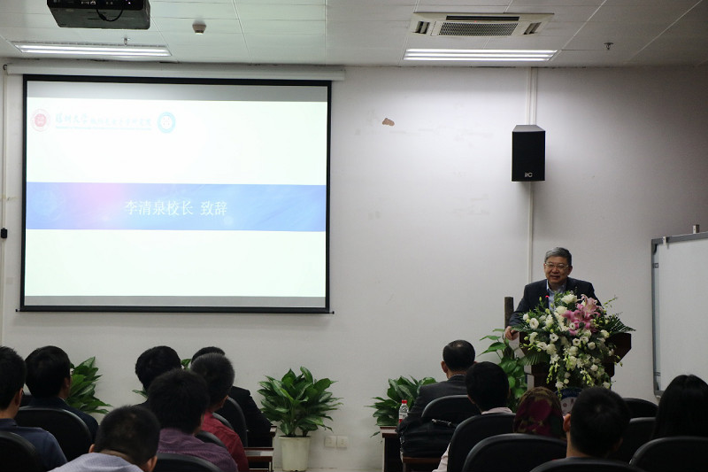 李清泉校长在致辞中对徐红星院士工作站的建立表示诚挚的祝贺。指出深圳大学光学与物理学近年发展迅速,随着深圳大学进入高水平二期建设和徐红星院士的到来,未来将会吸引更多优秀科学家的加入,深圳大学也将取得更多重大的科研成果。